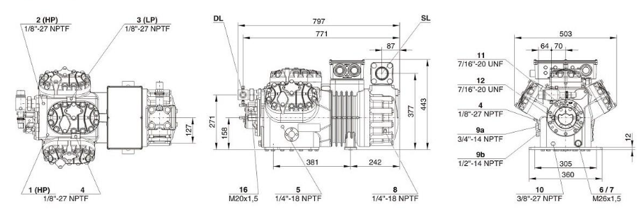 Вес компрессора — 235 кг, он содержит около 4,75 л масла. Уровень шума составляет 81,8 дБА, что относится к средним значениям для подобных устройств. Патрубки для подключения линий всасывания и нагнетания имеют размеры 2 1/8" и 1 3/8" соответственно. Габариты устройства — 443 мм в высоту, 797 мм в длину и 503 мм в ширину, что позволяет устанавливать его в ограниченном пространстве.